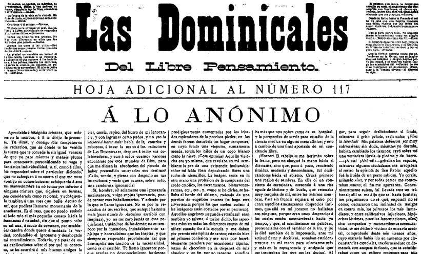 Te dejo dicho que poseo casi, casi, el don de profecía, como si dijéramos, de adivinación futura; ahora sabrás cómo también tengo el de adivinación presente. Con una facilidad asombrosa, que muchas veces me aterra y casi siempre me entristece, leo como en un libro abierto y español (que es el único idioma que conozco) el pensamiento de la mayoría de los mortales. Es el caso (y no temas que se enfaden mis compañeros de redacción, que son personas eminentísimas, para las cuales es sagrada la verdad), es el caso que he leído, en lo más hondo del pensamiento de alguno de ellos, cosas un poco agrias para mis pretensiones de poseer carácter y constancia en mis sentimientos. Sí, Lo Anónimo, sí; figúrate, y esto les honra en extremo, pues prueba el grandísimo amor que tienen a sus ideales, que he sorprendido en el cerebro de alguno ciertas dudas y temores de que yo sea una libre-pensadora de pega, o de paso (como las codornices), y claro se está que al pensar de este modo, me tienen por muy mujer; que sólo mi sexo (según apreciaciones del sexo contrario) es capaz de volubilidad, inseguridad y versatilidad, propia de todo ser desvalido y por lo tanto quebradizo. La cual adivinación ha venido a probarme, les ha probado a ellos y te lo debe probar a ti, como dos y dos son cuatro, la imposibilidad de que les usurpe sus destinos, que no pueden hacerse, así como así, esas trasgresiones; y además parece mentira que un ser tan fisgón como Lo Anónimo, no haya leído mi carta-prólogo, cuando comencé a escribir en Las Dominicales. ¿No viste allí clarito que no quería misiones ajenas, y que sólo buscaba en la pelea un sitio secundario, desde donde lanzar alguna que otra saeta a esas apretadas huestes de egoístas, rutinarios, ignorantes, supersticiosos, sensualistas, vanidosos y explotadores, que con la capa de prudentes, sensatos, vividores, cultos, religiosos y distinguidos están pesando como losa de plomo sobre esta desventura patria mía, esquilmándola, embruteciéndola, anonadándola con vapores de tiranía y de concupiscencia, intentando hacerla retroceder hasta las leyes bárbaras del despotismo; de todo lo cual es la primera víctima la desdichada mujer, que sube al patíbulo si mata, que se la empadrona en la infamia sí cae, que se la hunde en el hospital si la contagian, que se la asesina impunemente si falta, y que en cambio se la tiene como un menor de edad (¡!) para todos los actos de la vida en los cuales se trate de legislaciones, privilegios y regalías.