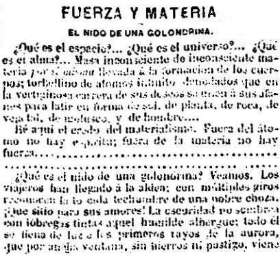 ¡Volad y recoged el átomo que surca el espacio, la paja que flota sobre el arroyo, la hierbecilla que se agostó sobre la roca, el limo que tapiza las praderas, el polvo que se amontona en los barrancos! ¡Surcad las inmensidades del cielo, felices golondrinas, y si algunos héroes de la tierra os preguntasen sobre fuerza y materia, llevadlos a los bordes de vuestro nido, y allí, mientras los pequeñuelos se agitan con terror pensando ver en los visitantes verdugos de su existencia, enseñadles vosotros, graciosas aves de la primavera, las profundidades de vuestro humilde albergue, explicándoles lo que es fuerza y materia delante de un nido de golondrina.