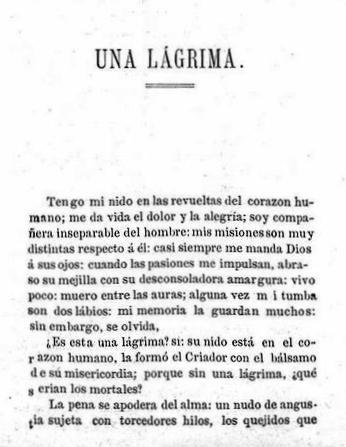 Las pasiones se desencadenan en el alma; el amor hiere con su arqueada flecha la fibra del sentimiento: lanzado el hombre por la peligrosa pendiente de sus deseos, siente impotente la fuerza de su voluntad para combatir al enemigo niño: sufre y goza a la vez; ama: el puñal de los celos se clava en su corazón; la desesperación turba su entendimiento, quiere morir y ni aun puede; sus ojos se humedecen y llora: con la lágrima se fue el ardoroso fuego de su pasión, y entre su alma quedó, como suave perfume del cielo, puro el amor: ésta es una lágrima.